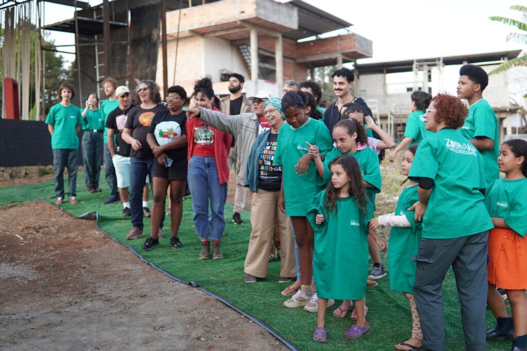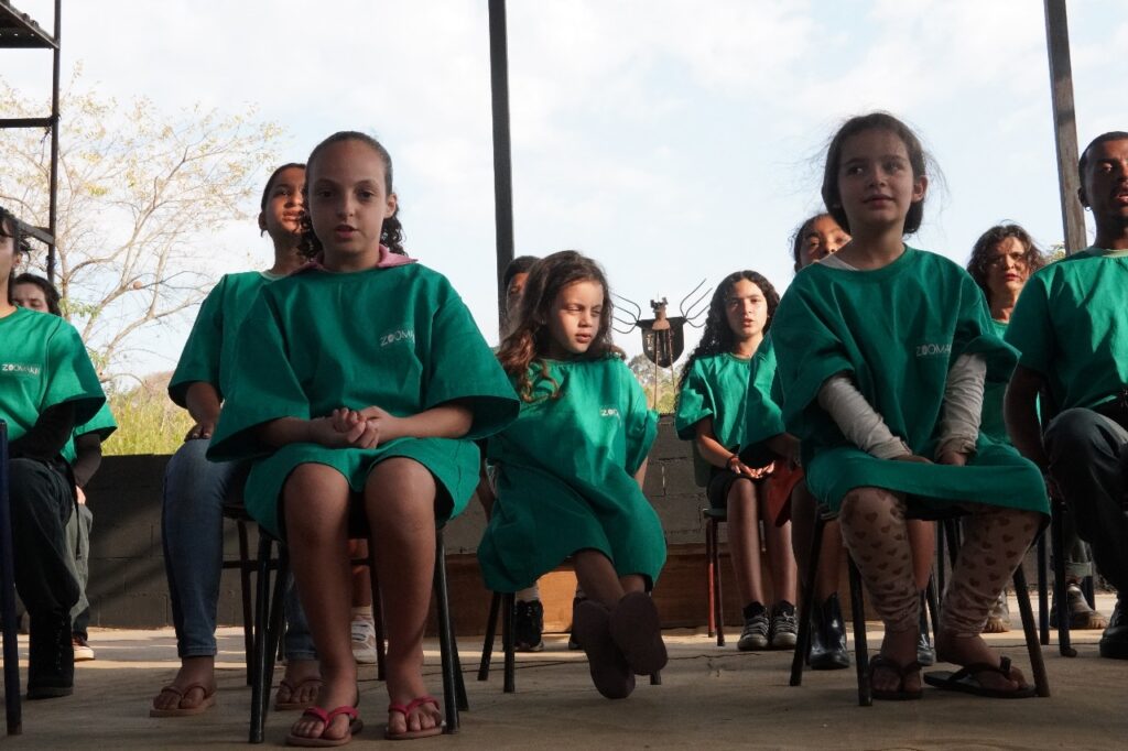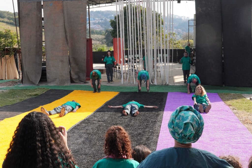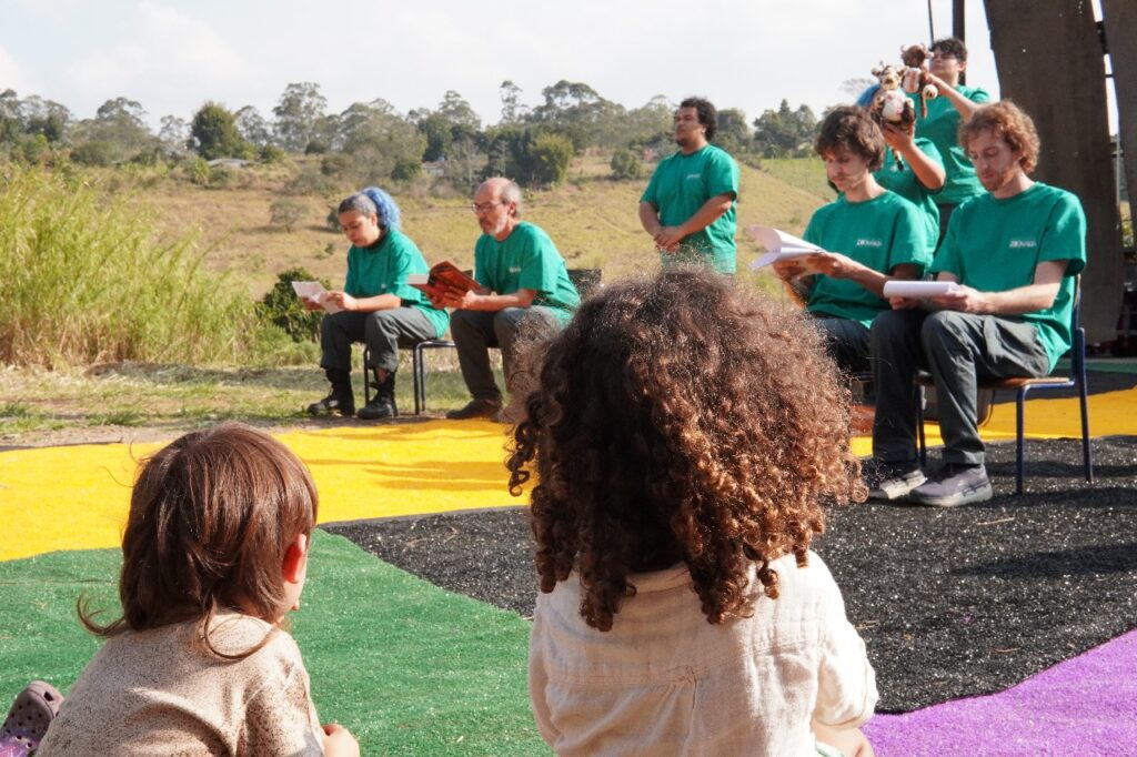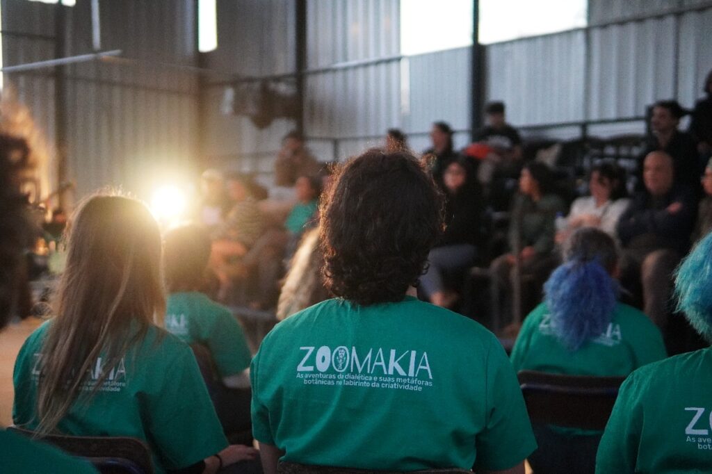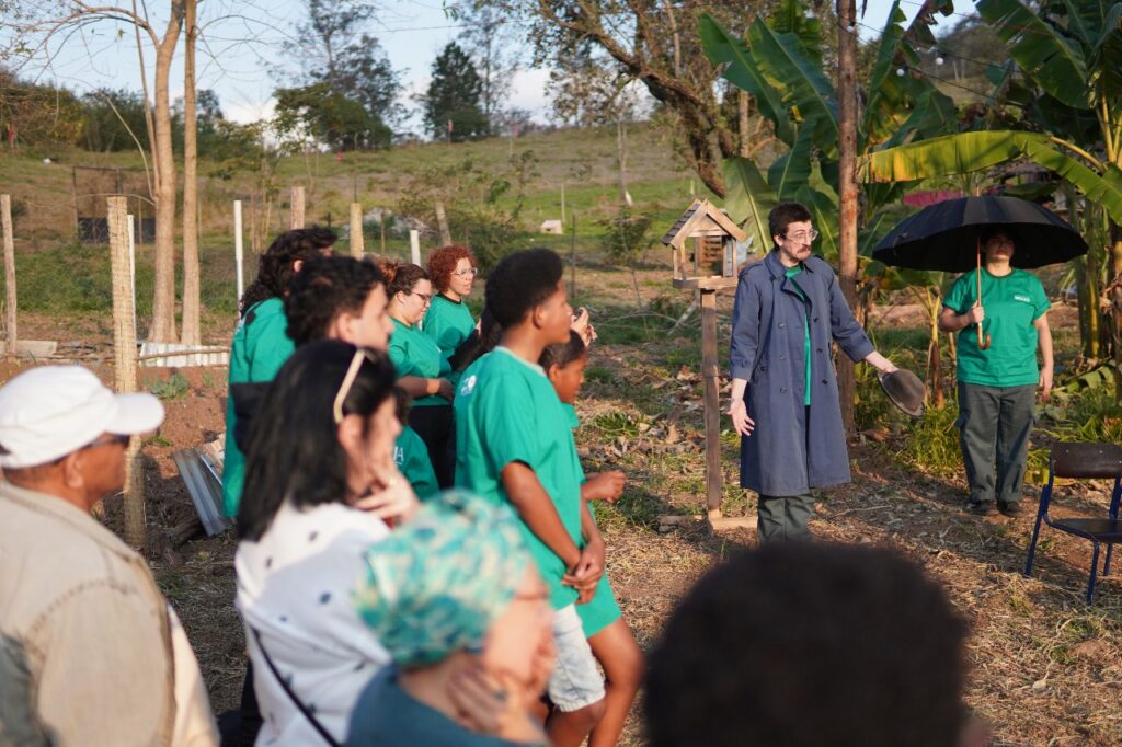 Esse é um ensinamento profundo que a arte também traduz. Por meio da gramática teatral, o grupo Zoomakia inscreve essa experiência nas cenas apresentadas (e relacionadas com) ao público: a denúncia contra a mercantilização da vida e, ao mesmo tempo, a celebração da potência criativa que brota da terra recuperada. Na voz de Dona Íris, no trabalho das famílias, na brincadeira das crianças que aprendem a plantar, a luta se torna afeto: é resistência que floresce em comunidade, fazendo do chão um lugar de vida compartilhada.