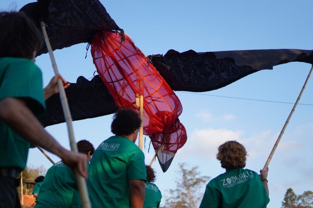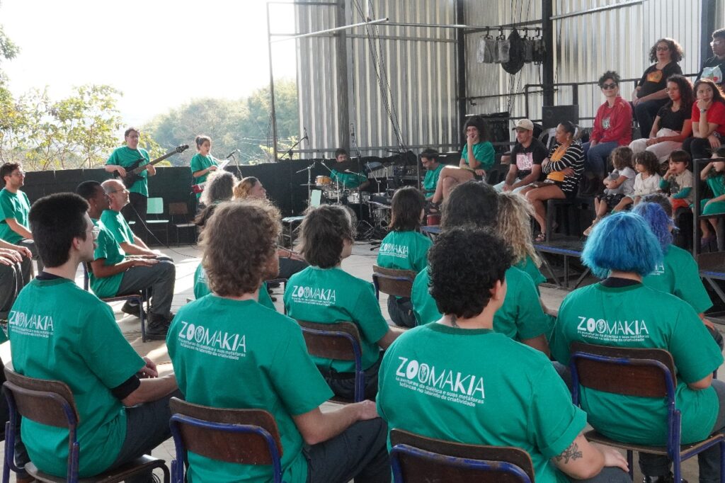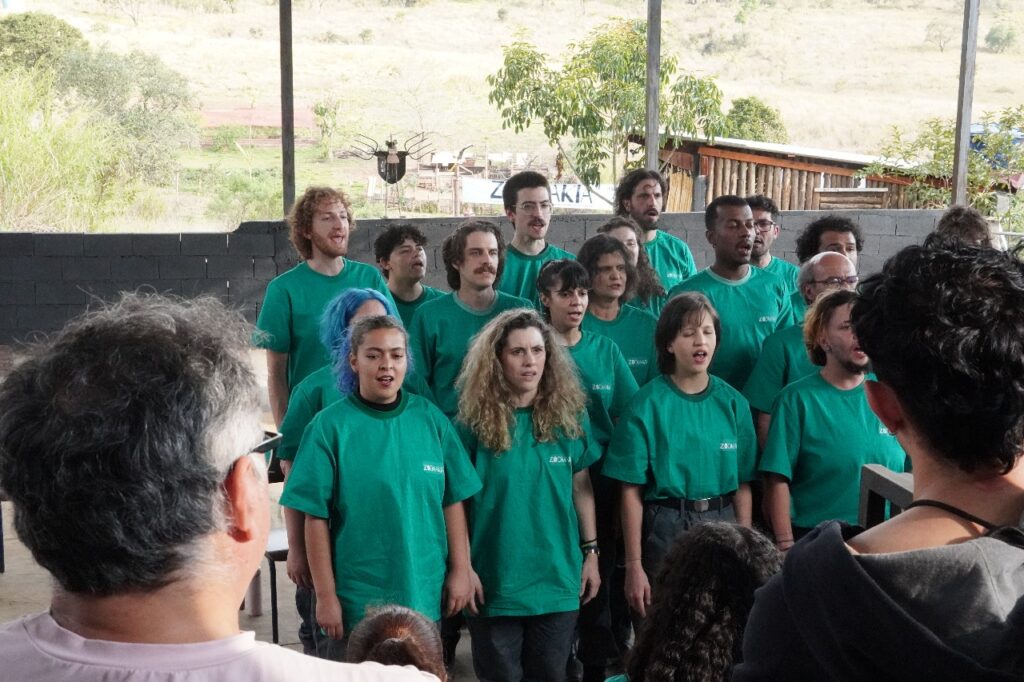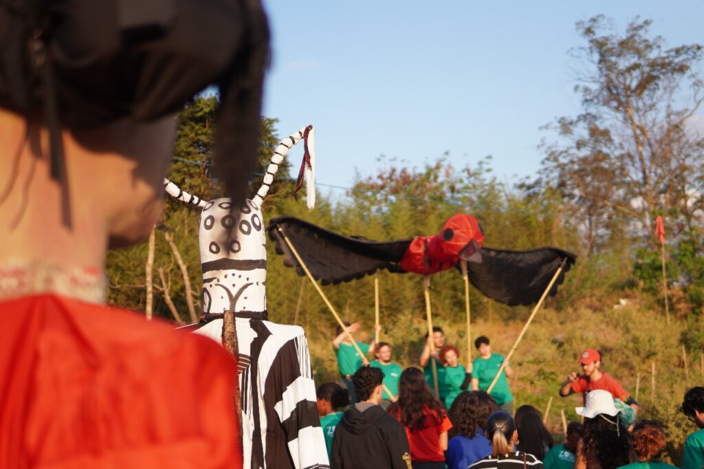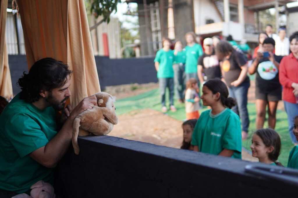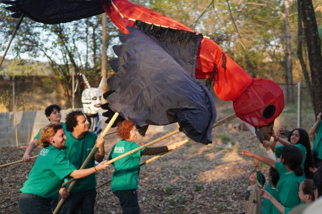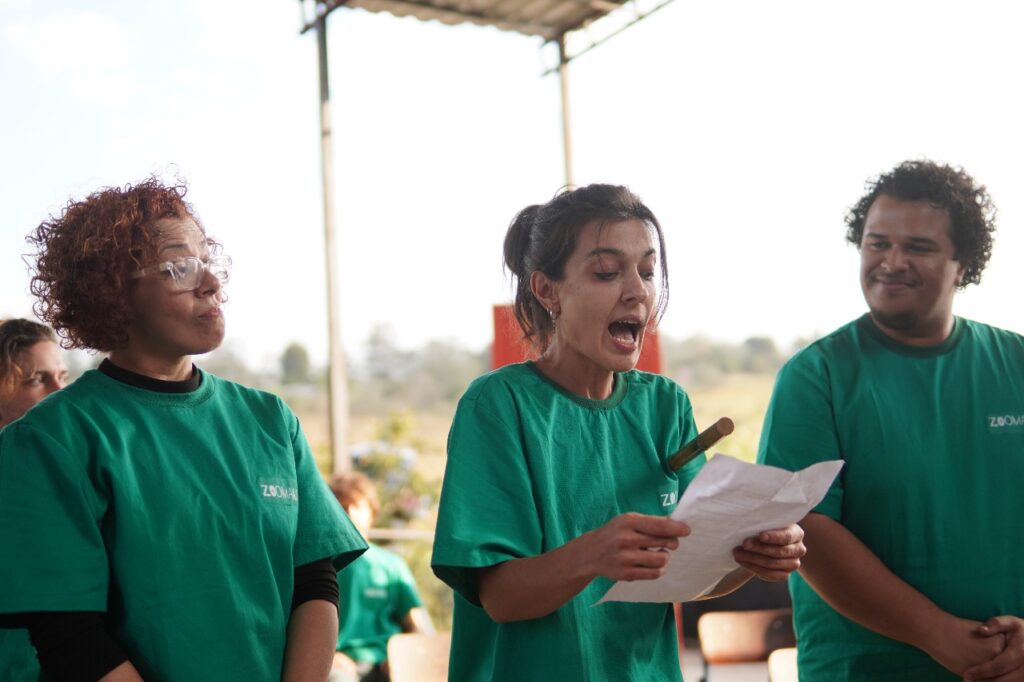 Esse é um ensinamento profundo que a arte também traduz. Por meio da gramática teatral, o grupo Zoomakia inscreve essa experiência nas cenas apresentadas (e relacionadas com) ao público: a denúncia contra a mercantilização da vida e, ao mesmo tempo, a celebração da potência criativa que brota da terra recuperada. Na voz de Dona Íris, no trabalho das famílias, na brincadeira das crianças que aprendem a plantar, a luta se torna afeto: é resistência que floresce em comunidade, fazendo do chão um lugar de vida compartilhada.