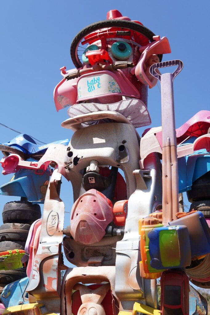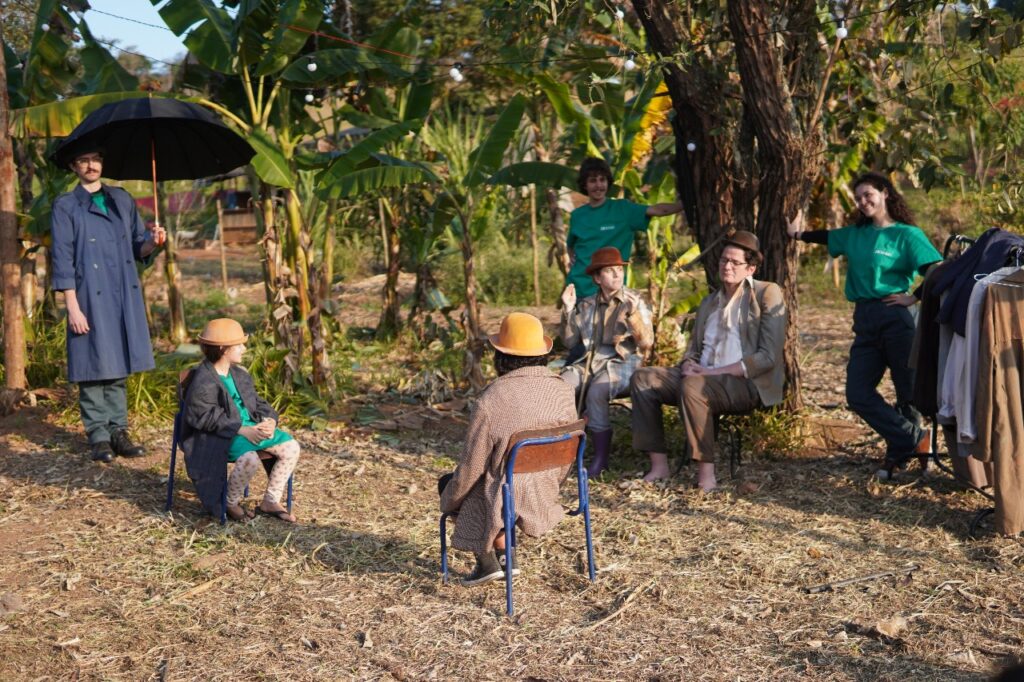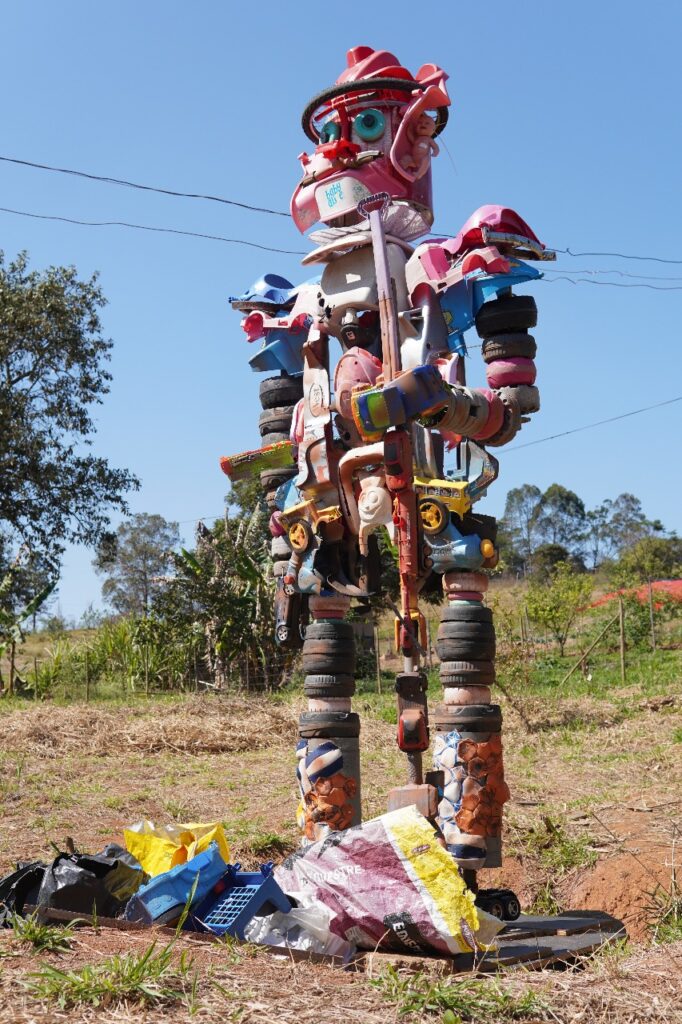 Adentrando o território, entre plantas, gramas e a possibilidade de encontrar animais pelo caminho (avisados pelos atores como visitas surpresa), nos deparamos com uma estátua em construção: um bandeirante feito de brinquedos quebrados. Uma metáfora plástica da violência colonial e da degradação contemporânea. Os restos de plástico que compõem a figura falam tanto da ocupação histórica dos territórios quanto do excesso de lixo em nossas vidas. Ao lado, seguindo o percurso, sentados em cadeiras, alguns atores com casacos e chapéus côcos repetem inúmeras vezes o verbo “havia”, abrindo a cena que ecoa Esperando Godot, de Samuel Beckett. Mas aqui o teatro se transforma em trincheira: o jogo entre presença e ausência, ser e ter, conduz a reflexão sobre a diferença entre existir e possuir, referência direta à propriedade privada.