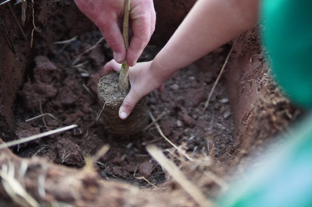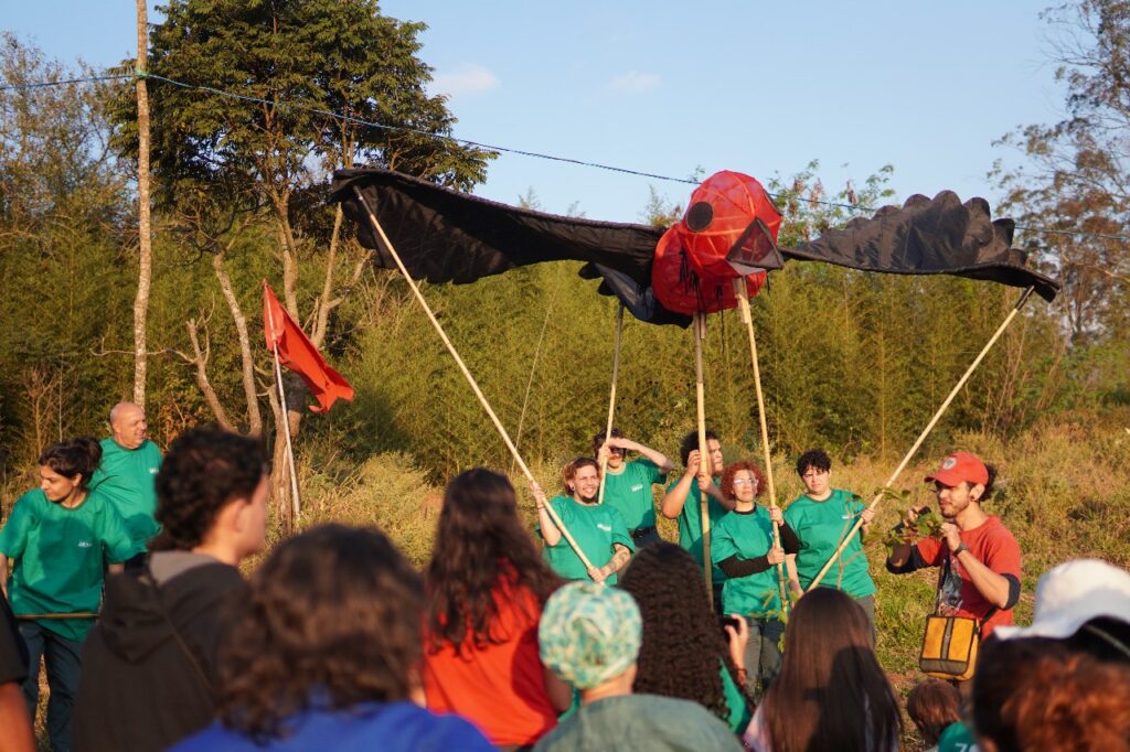 De lá, seguimos para o Tiê-Sangue: um pássaro de seis metros, feito de bambu e tecido, símbolo da Mata Atlântica. Se o bandeirante era plástico e destruição, o pássaro é leveza e vínculo territorial. Ele aponta para outra forma de viver: não acumular lixo, mas tecer futuros com materiais que não rompem com a vida. Ao seu lado, o canto dos atores guia a caminhada até o último ponto: uma clareira de plantio de árvores e mudas. Ali, um companheiro do MST explica, uma a uma, as plantas companheiras que devem ocupar a terra, fortalecendo-se mutuamente.