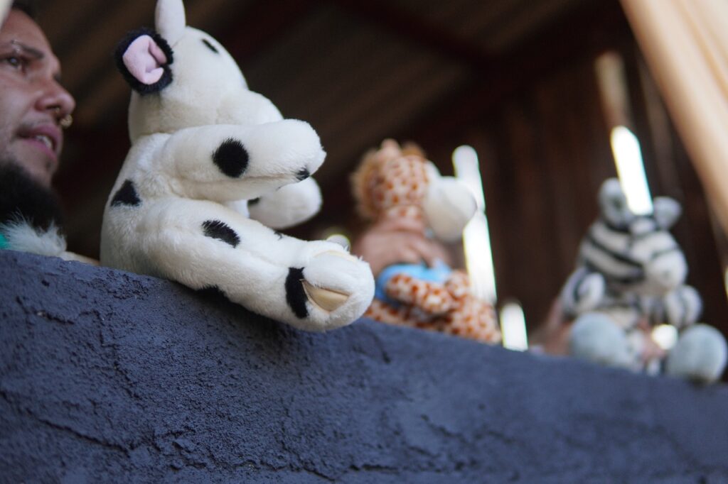 Seguimos o caminho junto aos atores no interior da Comuna. Entre diálogos com o público e risadas especialmente das crianças, chegamos a um espaço com uma janela cercada por cortinas onde repousam, quase ingênuos, os antigos ursinhos da Parmalat. Ali, os artistas convidam as crianças a refletirem: de onde vem o leite? O que há por trás das embalagens coloridas e propagandas de vaquinhas sorridentes? A lembrança da LBR Lácteos Brasil – denunciada por adulterar leite com formol, soda cáustica e água oxigenada – escancara como a mercadoria pode esconder violências. Na cena de fantoches, as crianças descobrem e anunciam que o leite não nasce na caixinha, mas no corpo das vacas, e que existem modos de produção que cuidam da vida. É uma cena de afeto e conscientização: mãos pequenas levantadas, olhos curiosos, o riso que também ensina sobre alineação e envenenamento, bem como sobre outra forma de construir a nossa relação com o mundo.