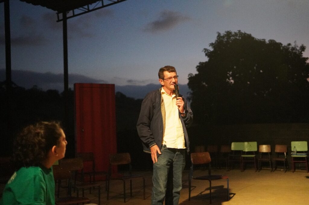 Como última atividade, ouvimos a fala do companheiro Gilmar Mauro — dirigente nacional do MST — sobre a importância da articulação entre arte e luta política. Sua crítica à conjuntura atual foi certeira: apesar de termos hoje um governo que se diz “progressista”, a pauta da Reforma Agrária pouco avançou, e as ofensivas contra os territórios seguem fortes. Gilmar lembrava que a luta por terra, território e soberania alimentar é também uma luta contra o esquecimento, ainda mais diante das sucessivas ofensivas que os territórios do MST vêm sofrendo.