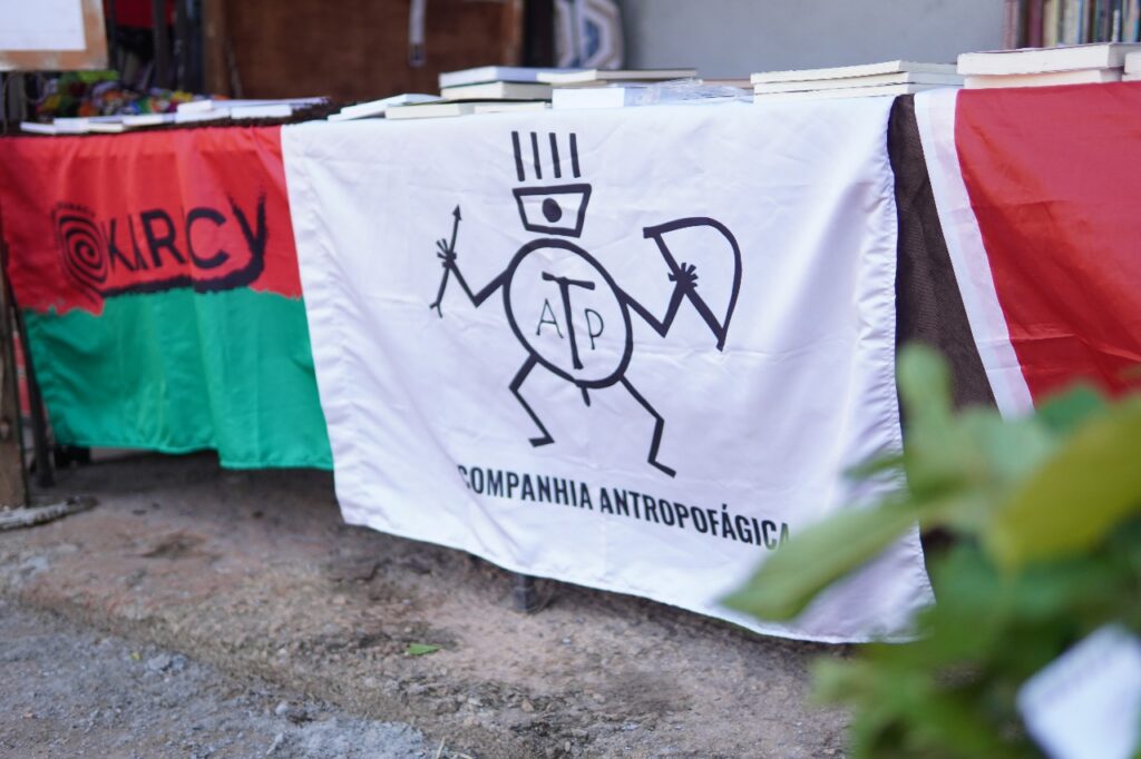 Durante as atividades promovidas pelo grupo Zoomakia, o espaço Okaracy se transformava também em feira da agricultura familiar e coletiva do MST. Logo na entrada, encontrávamos uma “mesa de câmbio”: a proposta era que trocássemos reais (via pix, é claro) por uma moeda própria, que circularia dentro da feira. Para a militante e atriz, Renata Adrianna, essa era uma primeira experiência de desdólarização das relações comerciais. Produtos, relações de compra e venda, e arte se articulavam nesse exercício que rompia com a lógica capitalista. Cada verdura, cada pão, cada produto, era vendido diretamente pelas mãos de quem o plantou, quebrando o abismo que o mercado cria entre quem produz e quem consome. Mais do que conhecer a terra, ali aprendíamos histórias de vida, de cuidado e de luta.