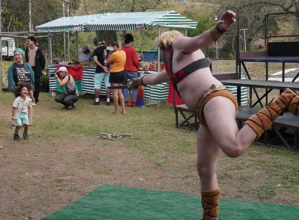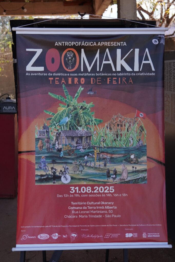 O caminho começa em Okaracy – espaço de arte da Companhia Antropofágia de Teatro, no coração do território da Comuna Irmã Alberta, do MST. Ali, mais de vinte atores se movem, dançam, brincam, atravessam as pessoas convidando à interação, a proposta artística tem como título “Zoomakia – Aventuras da Dialética e suas Metáforas Botânicas no Labirinto da Criatividade” e foi dirigida por Thiago Reis Vasconcelos (fundador da Companhia Antropofágica e ex-presidente da Cooperativa Paulista de Teatro). Surge, de repente, um He-Man divertido e nada convencional, que evoca as canções conhecidas pelas gerações passadas, mas também as moralejas daquele desenho animado que marcou os anos 1980. Entre risos e lembranças, o que se resgata não é só memória, mas a crítica: nos cânticos ecoam a denúncia de Karl Marx à “mercadoria” e à sua característica mais trágica, a alienação. Essa crítica atravessa todo o percurso proposto pelo grupo Zoomakia, conectando arte e política, teatro e feira agroecológica, sonho e vida concreta das famílias Sem Terra. Aqui, a arte não é enfeite verborrágico: é denúncia, mas também reencantamento, um gesto de semear vínculos entre pessoas, territórios e a vida que pulsa ao redor.