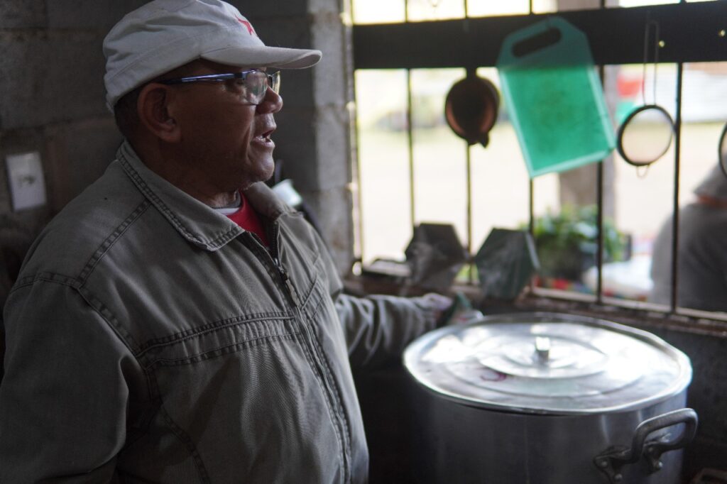 Enquanto os atores se preparavam, os produtores ajeitavam suas barraquinhas de verduras e frutas, e outras pessoas se reuniam em torno da cozinha para preparar o almoço coletivo: um Baião de Dois. No vai e vem da cozinha, uma figura chamava a atenção: o companheiro Cícero de Crato, cearense, 66 anos de vida dedicados à luta pela terra, sendo vinte deles no MST. Antes mesmo do nascimento do Movimento em 1984, já fazia parte das Ligas Camponesas, enfrentando latifúndio e repressão.