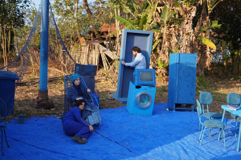 Mais adiante, ergue-se uma casa azul, pintada e organizada pelo cenógrafo Márcio Medina. O azul, cor de tristeza, segundo Medina, atravessa paredes, roupas, móveis antigos. Entre eles, uma mulher centenária, vestida com trajes de outro século, senta-se firme no centro do cenário. Ao redor, eletrodomésticos e objetos “modernos” expõem o choque dos tempos. Essa casa é memória encarnada: um matriarcado invisibilizado pela história oficial, mas presente na resistência cotidiana das mulheres que carregam, em seus corpos e gestos, a força de sustentar sociedades inteiras. Entre a tristeza e a dignidade, o espaço revela que a luta também é feita de lembrança e cuidado do ontem e do hoje.